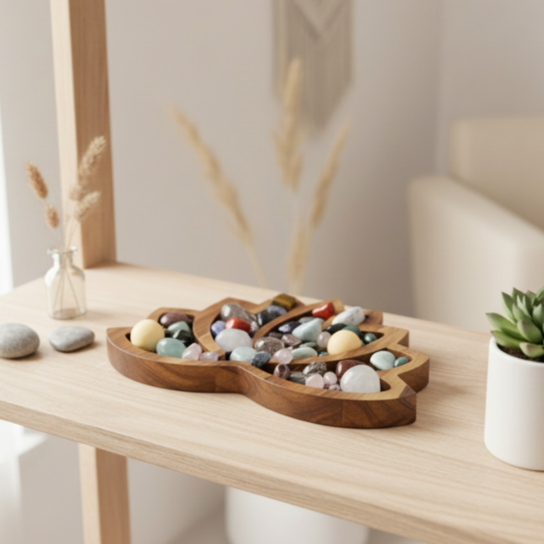 This wooden crystal display tray is designed to beautifully organise and showcase tumbled stones, crystals, and small keepsakes in one intentional space. The lotus shape and natural wood finish make it both a functional organiser and a calming home décor piece.